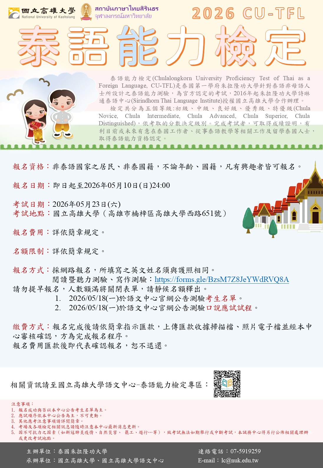 轉知-[國立高雄大學]有關本校辦理「2026年CU-TFL泰語能力檢定(高雄場)」已開放報名,敬請協助轉知相關人員踴躍報考,至紉公誼,請查照。