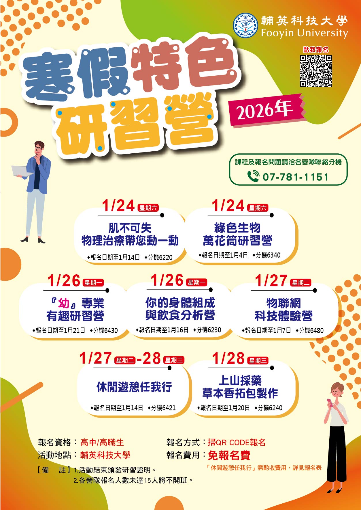 (四)報名方式:請掃描海報上QR CODE或至輔英科技大學首頁/招生資訊網/研習營連結網址報名。